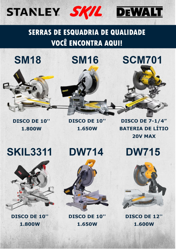 Serras Stanley, Dewalt e Skil e seus acessórios estão presentes na melhor loja.